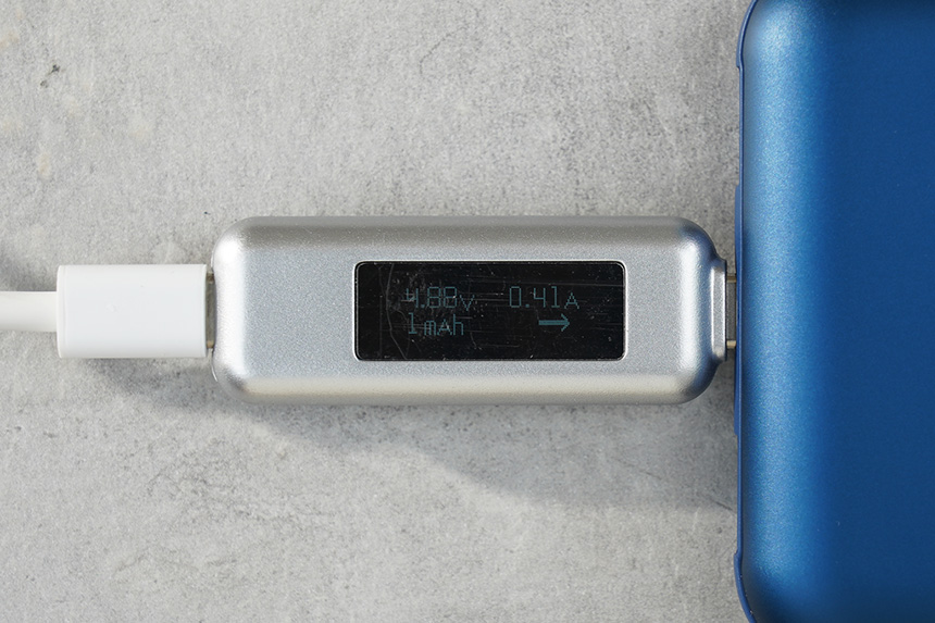 삼성전자의 정품 케이블의 경우에는 11.7V, 1.53A 정도까지 측정이 되었고 번들 케이블은 4.88V, 0.41A로 충전이 되었습니다. 케이블에 따라서 충전 속도의 차이가 발생하고 특히 다양한 주변기기에 포함된 케이블은 제대로된 충전 속도를 보여주지 못했습니다.