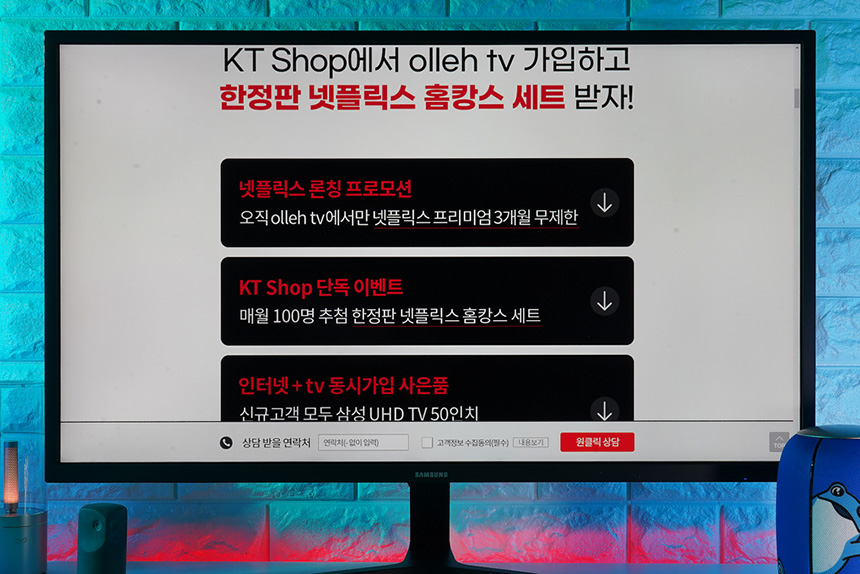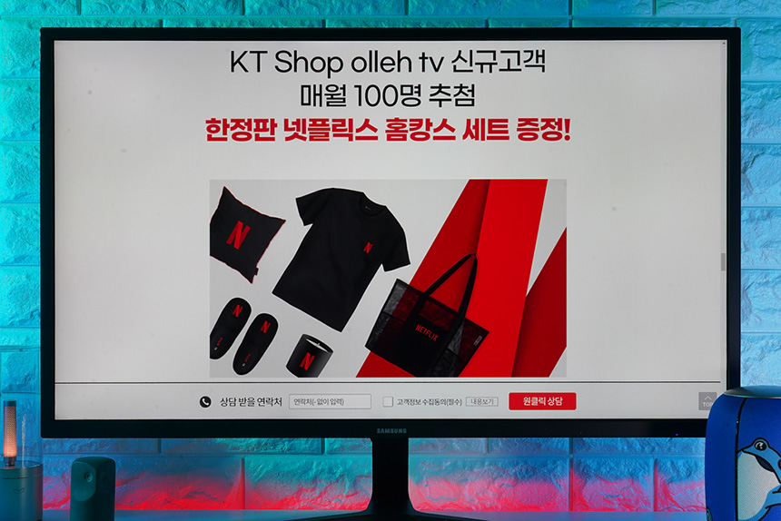 이번 KT 프로모션 이벤트는 총 3개로 구성되어 있습니다. 우선 olleh tv 신규 고객은 넷플릭스 프리미엄 요금제를 3개월 이용할 수 있는 기회가 제공됩니다. 그리고 KT SHOP 올레tv 신규고객은 매월 100명을 추첨해서 한정판 넷플릭스 홈캉스 세트가 증정됩니다. (기가 인터넷 최대 500M 이상 + tv 에센스 이상 + 기가지니2 신규 가입 기준) 마지막으로 인터넷과 tv를 동시에 가입하면 삼성이나 LG의 UHD TV가 무료로 제공됩니다.