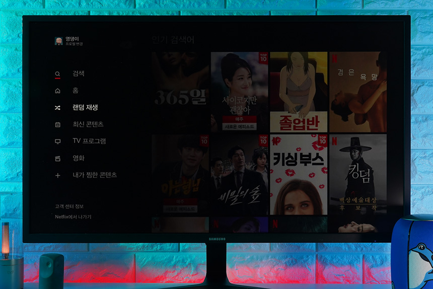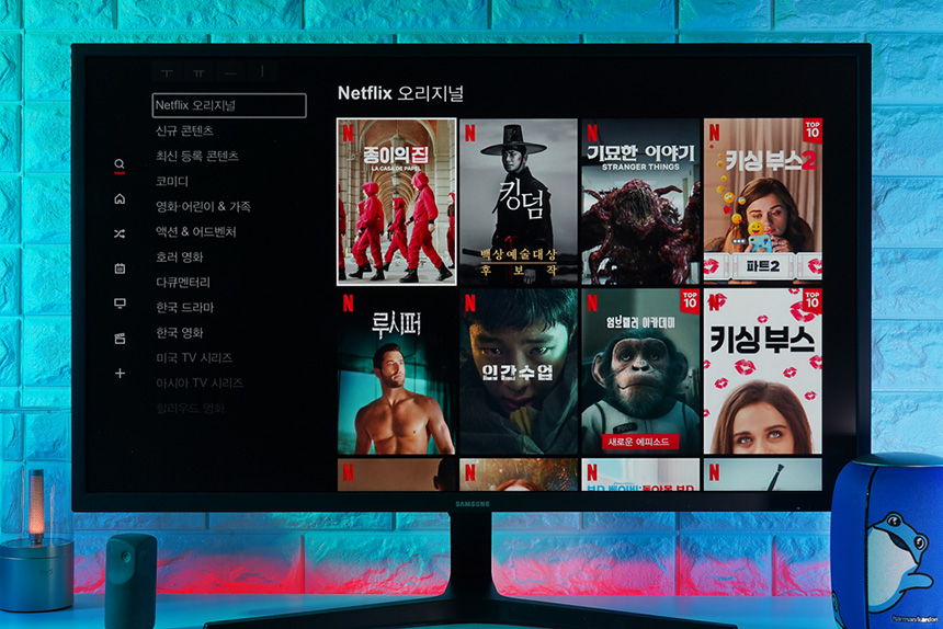왼쪽에는 메뉴가 배치되어 있는데 가장 상단에는 검색 기능이 탑재되어 있고 아래쪽에는 Netfilx 오리지널 시리즈 등 다양한 콘텐츠들이 카테고리별로 정리되어 있습니다. 그리고 홈 메뉴에서는 지금 뜨고 있는 콘텐츠의 리스트가 표시되고 영상을 시청할수록 자신의 취향에 맞는 작품들이 추천됩니다.