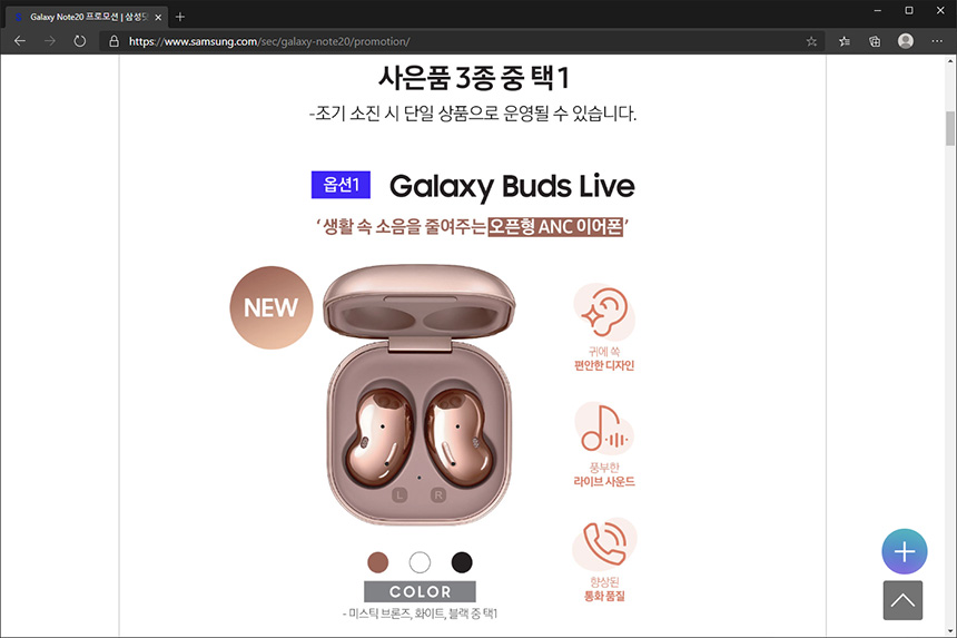 삼성전자에서는 자사의 플래그십 스마트폰의 사전예약에 참여하면 다양한 사은품을 제공하는 이벤트를 진행하는 경우가 많습니다. 그리고 이번 갤럭시 노트20, 노트20 울트라의 경우에는 갤럭시 버즈 라이브가 포함되어 있습니다.