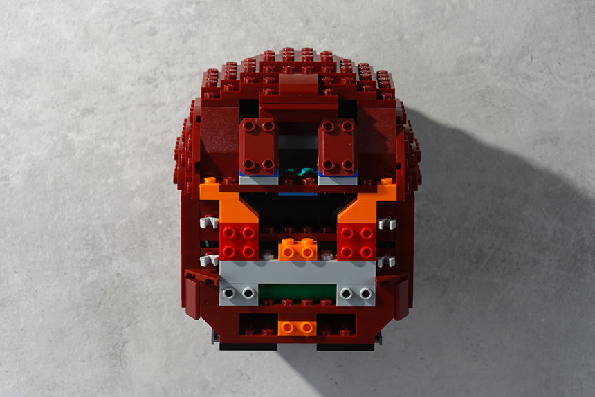 입 주변의 부품들은 어느 정도 움직임 수 있도록 제작되었습니다. 그리고 취향에 맞게 약간 정도는 변형해서 전시할 수 있습니다. 그리고 의도한 것인지는 모르지만 눈 아래쪽 LEGO 로고 부분도 방향이 맞춰져 있습니다.