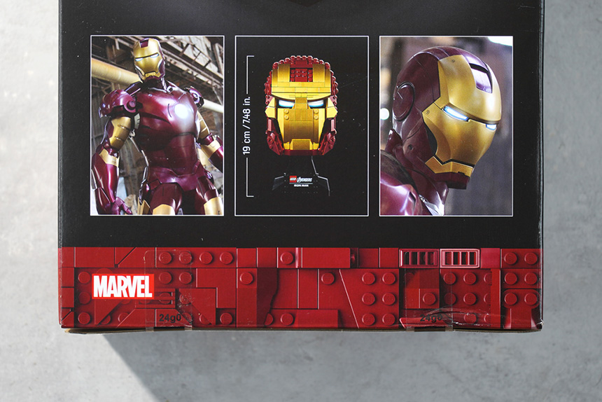 뒷면의 아래쪽을 살펴보면 레고 76165 아이언맨 헬멧은 아이언맨 슈트 MK3를 기반으로 제작된 것으로 보입니다. MCU 영화에서 결빙 현상을 해결하기 위해서 재질을 변경했고 골드와 레드 컬러로 도색이 되었습니다.