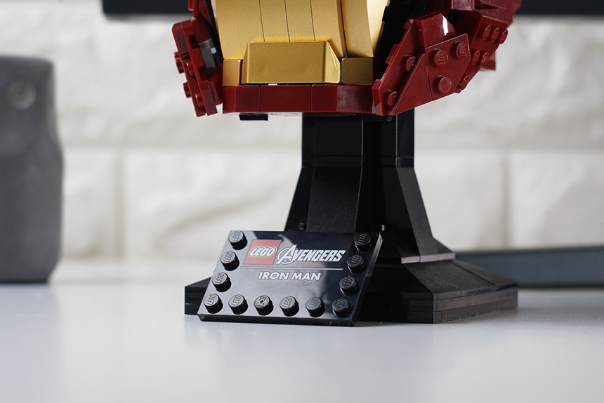 스탠드의 앞쪽에는 레고 어벤져스 아이언맨이라는 명패가 부착되어 있는데 이 부분은 프린트형태로 마무리되었습니다. 그런데 흠집이 조금 많은 편이라는 점은 아쉬운 부분입니다.