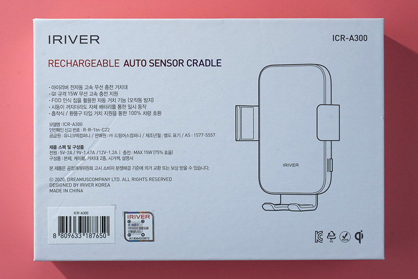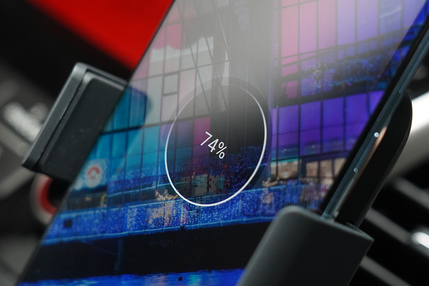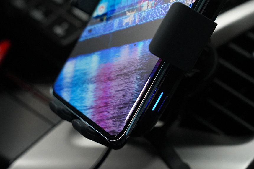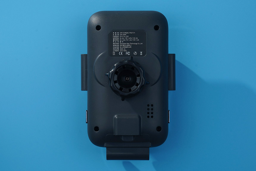 아이리버 ICR-A300은 최대 15W 출력의 무선충전을 지원합니다.(안드로이드 스마트폰 기준, 아이폰은 7.5W) 그리고 좌우에는 자동 슬라이드 그립이 배치되어 있어서 스마트폰이 감지되면 안정적으로 고정해주는 역할을 합니다.
