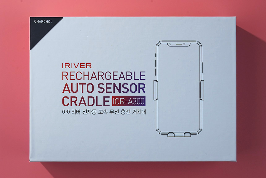 아이리버 ICR-A300의 박스는 깔끔한 형태로 제작되었습니다. 그리고 전면에는 본체의 형태와 함께 아이리버 전자동 고속 무선 충전 거치대라는 문구가 인쇄되어 있습니다.