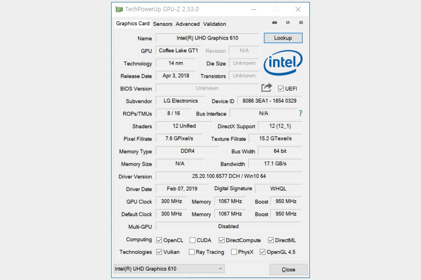 인텔 펜티엄 5405U 프로세서에는 UHD 그래픽스 610 내장 그래픽 카드가 포함되어 있습니다. 사무용으로 사용하기에 크게 부족하지 않은 성능을 제공하고 그래픽 최대 동작 주파수는 950HMz입니다.