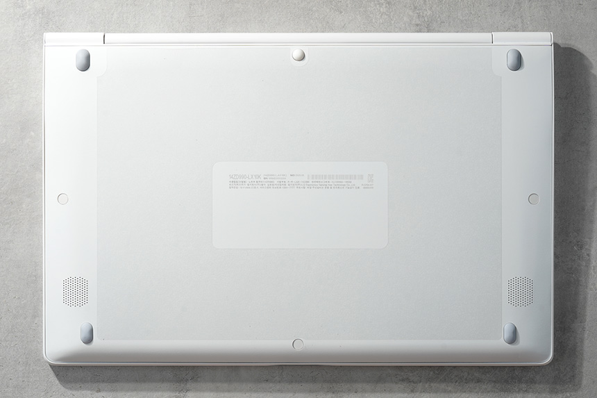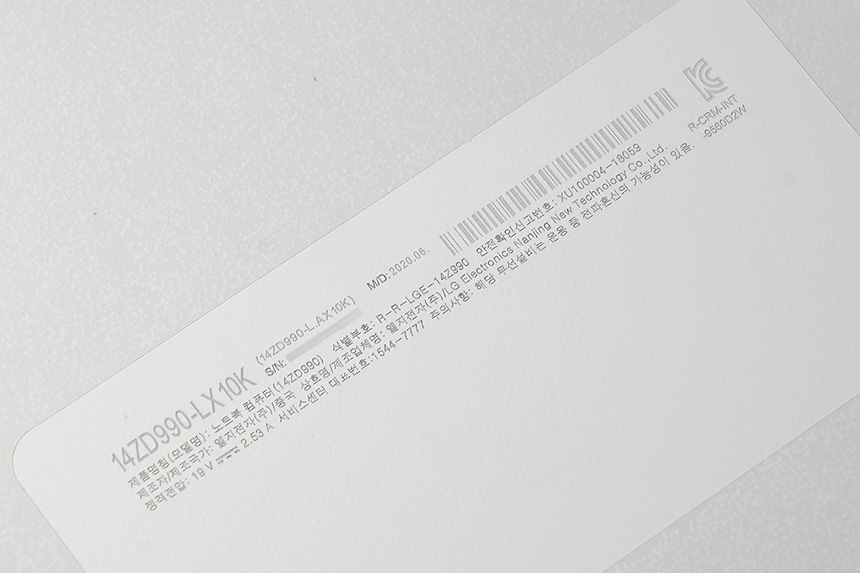 하판의 중앙에는 14ZD990-LX10K라는 모델명과 시리얼 넘버 등이 표시되어 있습니다. 그리고 AS 관련 정보도 인쇄되어 있는데 편리하게 사후지원을 받을 수 있다는 점이 국내 대기업의 노트북을 선택하는 이유이기도 합니다.