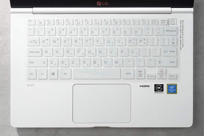 상단에는 심플한 디자인에 포인트가 되는 그램의 로고가 부착되어 있습니다. 그리고 사용기를 위해서 제거했지만 상판을 보호하는 역할을 하는 필름이 기본으로 장착되어 있습니다.