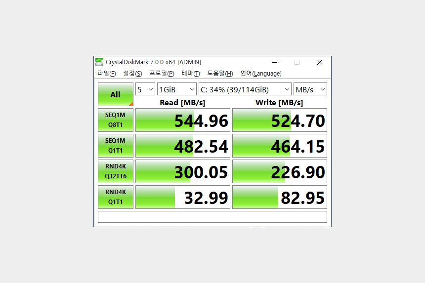 LG전자 2019 그램 14ZD990-LX10K에는 128GB 용량의 M.2 SSD가 탑재되었습니다. 속도는 준수한 편이었고 만약 용량이 부족하다고 생각되는 분들은 마이크로SD 카드나 외장 SSD를 이용하는 것이 좋을 것 같습니다.