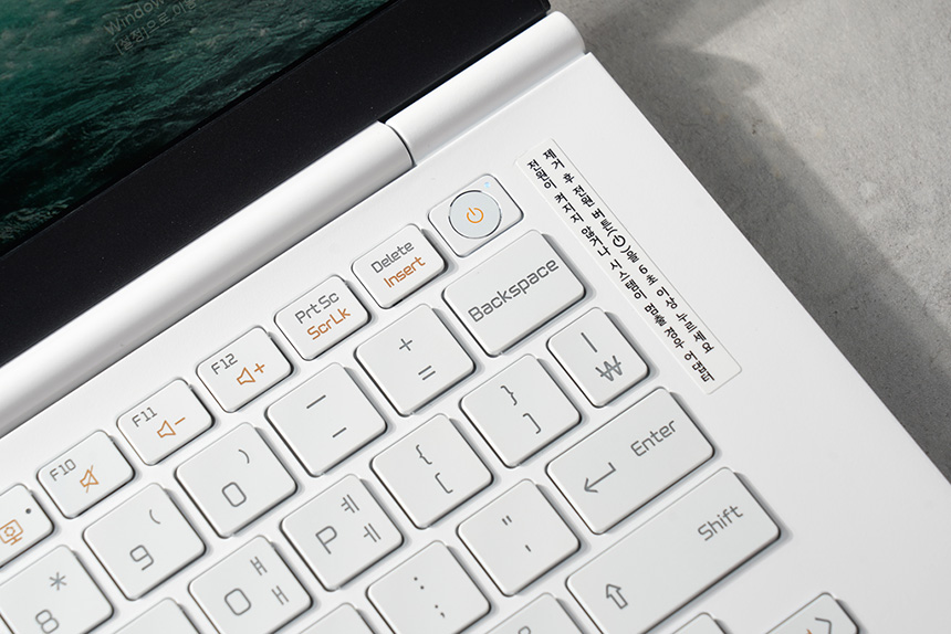키보드의 오른쪽 위에는 전원 버튼에 지문인식 센서가 내장되었습니다. 그래서 전원을 켜는 것과 동시에 잠금을 해제할 수 있습니다. 상당히 편리한 부분 중의 하나입니다.