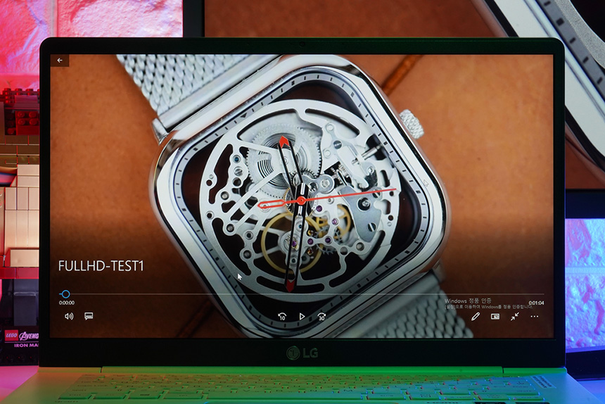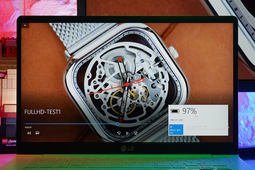 LG전자 2019 그램 14ZD990-LX10K에는 72Wh 용량의 배터리가 탑재되었습니다. 그리고 FULL HD 해상도의 동영상을 배터리 절약모드(화면 밝기 50%, 와이파이 꺼짐)에서 약 17시간 36분 정도 재생할 수 있었습니다.