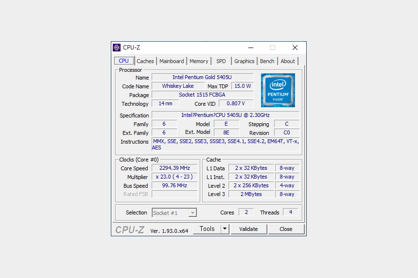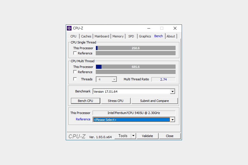 CPU-Z의 벤치마크 기능을 이용해서 인텔 펜티엄 5405U 프로세서의 성능을 확인해 보면 싱글 스레드는 250점 멀티 스레드는 685점이 측정되었습니다. 고성능은 아니지만 라이트한 작업에서는 크게 불편할 것 같지는 않습니다.