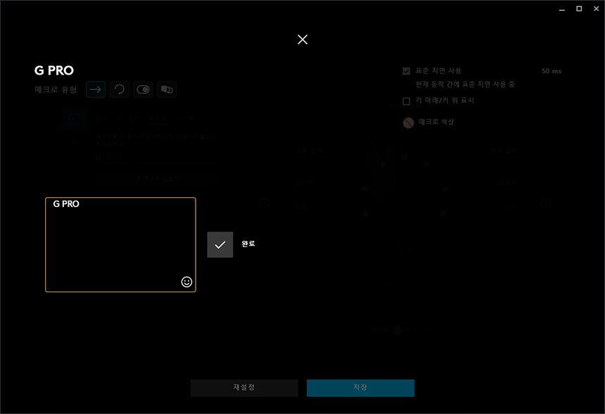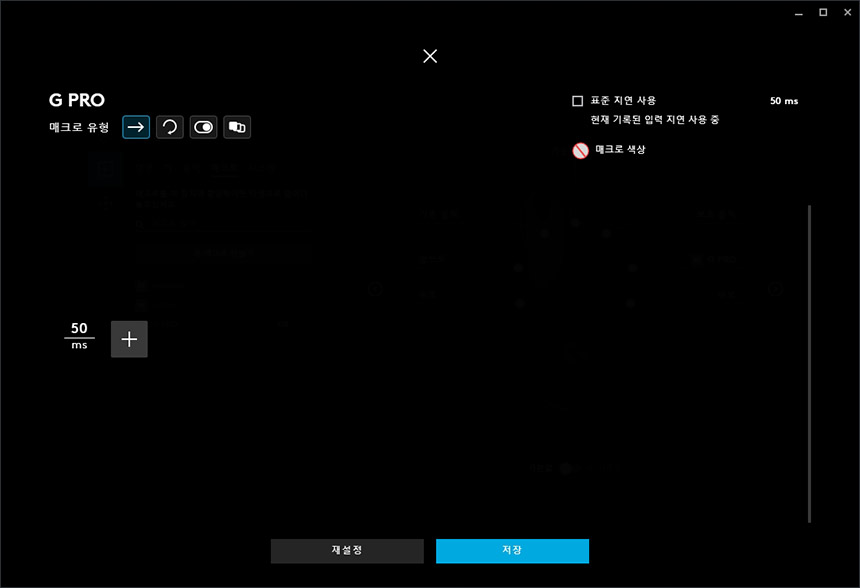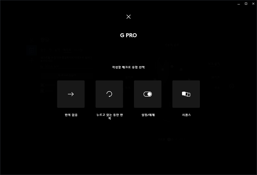 로지텍 G HUB에서는 강력한 매크로 기능을 지원합니다. 우선 초기 설정에서는 반복 없음이나 누르고 있는 동안 반복 그리고 설정/해제 등 다양한 옵션들이 준비되어 있는 것을 확인할 수 있습니다.