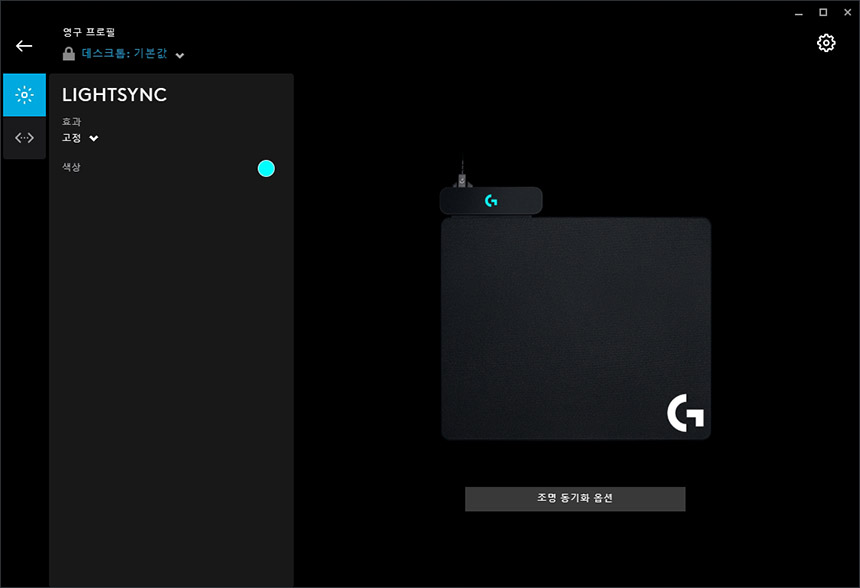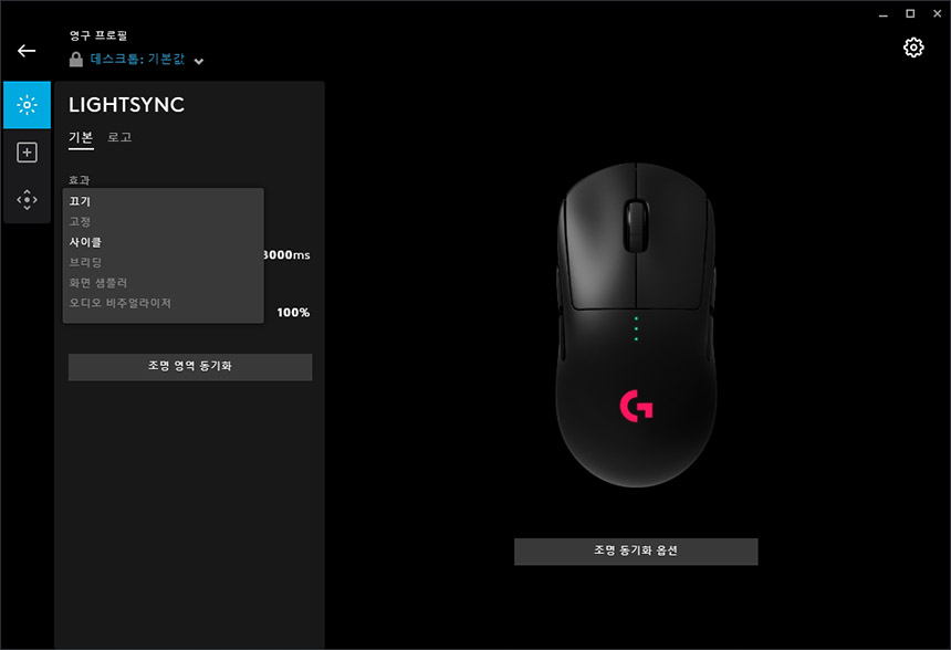 우선 LIGHTSYNC 메뉴를 확인해보면 기본과 로고의 효과를 취향에 맞게 설정할 수 있습니다. 그리고 로지텍의 다른 게이밍 기어를 같이 사용하고 있다면 조명 동기화 옵션을 통해서 색상과 효과를 일체화시켜줄 수 있습니다.