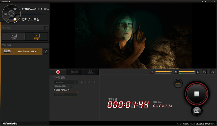 HDR 콘텐츠가 에버미디어 Live Gamer Ultra(GC533)에 입력되면 리코딩 메뉴의 HDR 버튼이 활성화됩니다. 참고로 HDR 콘텐츠는 1080p60까지 녹화를 할 수 있습니다.