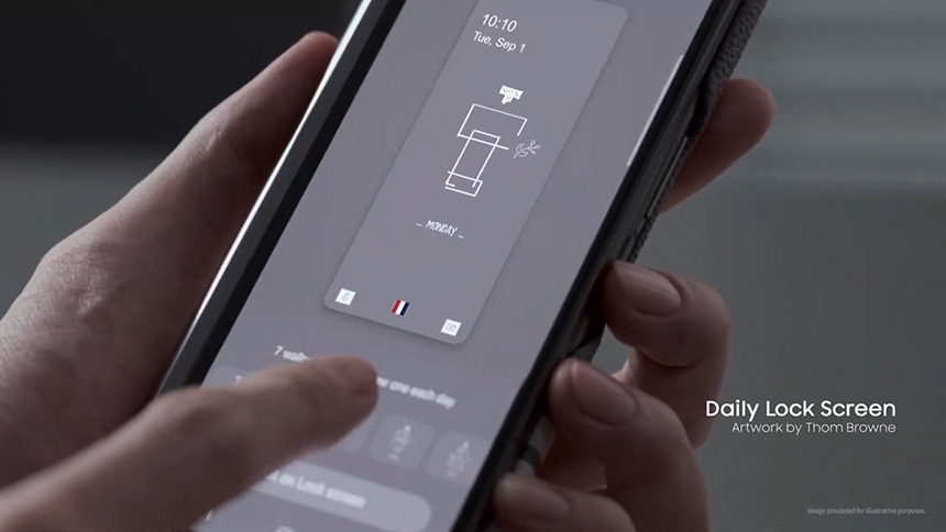 갤럭시 Z 폴드2 톰브라운 에디션의 특별한 기능을 확인해보면 우선 데이일리 락 스크론이 제공되는데 모던한 느낌을 주는 편입니다. 그리고 전용 아이콘 등도 포함되어 있습니다.
