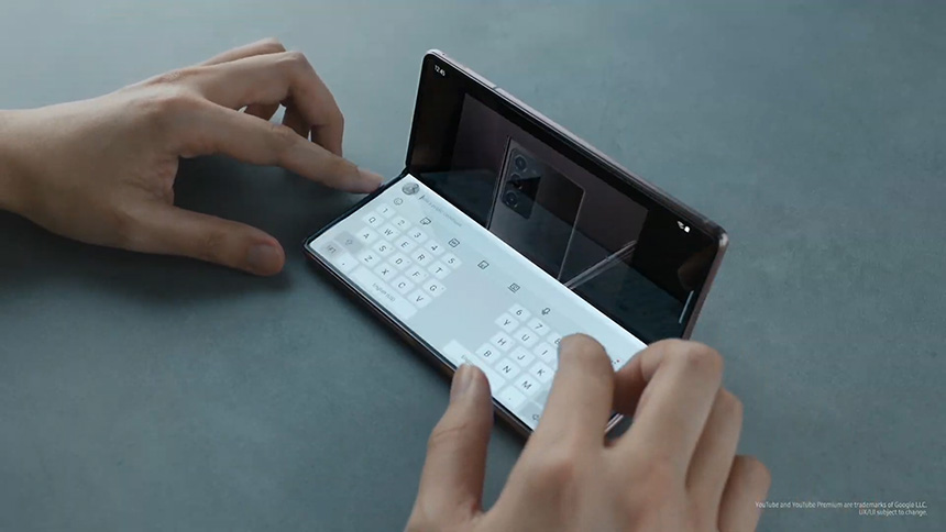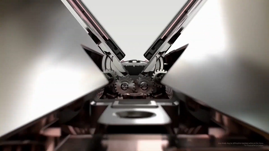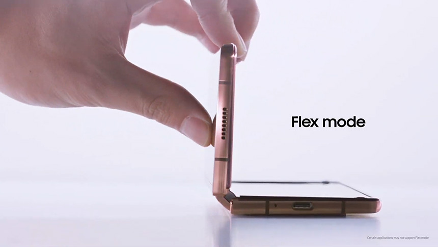 갤럭시 Z 폴드2에 탑재된 하이드어웨이 힌지는 듀얼 CAM 매커니즘으로 제작되었는데 특히 다양한 각도로 디스플레이를 고정할 수 있는 플렉스 모드를 지원합니다.