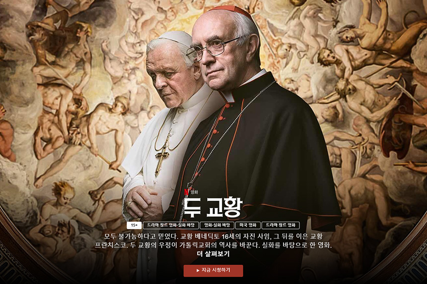 “두 교황”은 안소니 홉킨스와 조너선 프라이스가 주연한 넷플릭스 오리지널 영화입니다. 교황 베네딕토 16세와 교황 프란치스코를 다루고 있는 상당한 수작이라는 평가를 받고 있습니다.