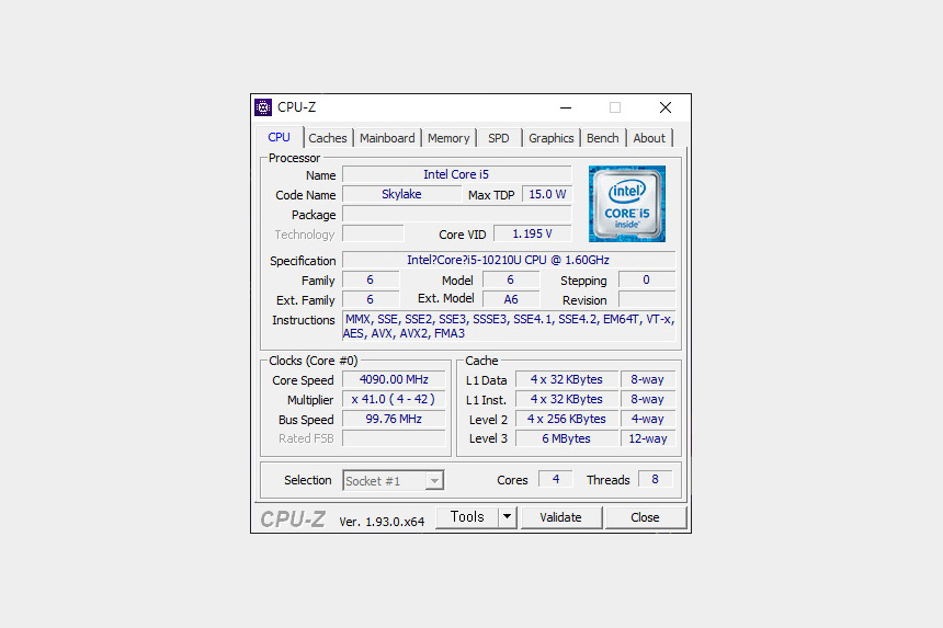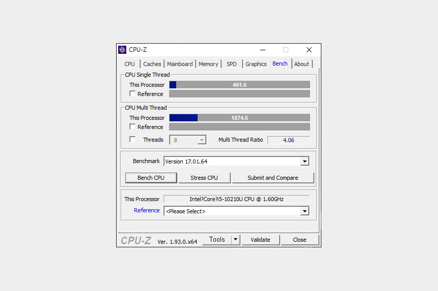 10세대 인텔 코어 i5-10210U 프로세서의 성능을 CPU-Z를 통해서 확인해보면 싱글 스레드는 461점, 멀티스레드는 1874점이 측정되었는데 무난한 편이라고 할 수 있습니다.