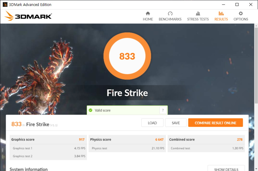 3D MARK를 통해서 내장 그래픽카드의 성능을 확인해보면 833점이 측정되었습니다. 준수한 편이라고 할 수 있고 과연 게임도 플레이할 수 있을지는 잠시 후에 확인해보도록 하겠습니다.