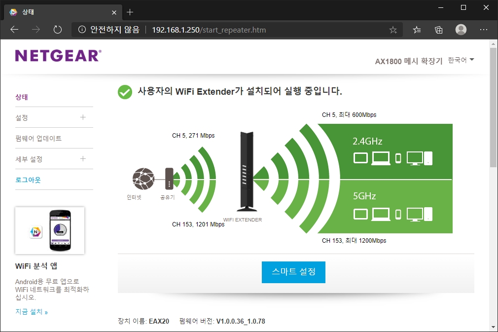 넷기어 EAX20 와이파이 증폭기의 WEB GUI는 www.mywifiext.net이나 192.168.1.250라는 주소로 접속할 수 있습니다. 그리고 홈 화면에서 현재 네트워크 상태를 바로 확인할 수 있습니다.