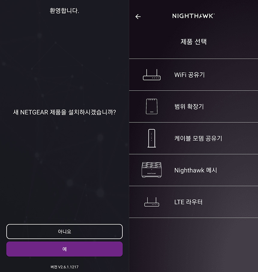 나이트호크 앱을 실행시키면 “새 NETGEAR 제품을 설치하시겠습니까?” 메시지가 표시되고 제품을 선택할 수 있습니다. 이때 “범위 확장기”를 클릭해주면 다음 단계로 넘어갑니다.