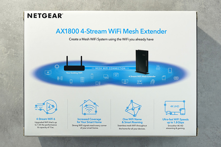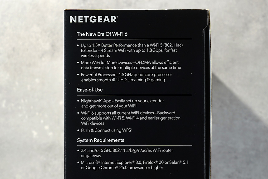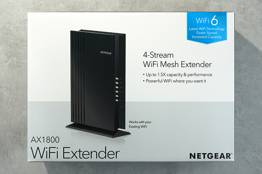 넷기어 EAX20 와이파이 증폭기의 박스는 깔끔한 형태로 제작되었습니다. 그리고 오른쪽 위에는 최신 규격의 WiFi6를 지원한다는 문구가 표시되어 있습니다. 그리고 기존 802.11ac(와이파이5) 대비 최대 1.5대 더 향상된 성능을 제공합니다.