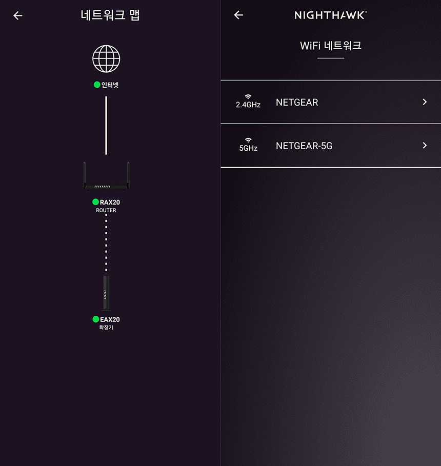 그리고 네트워크 맵을 통해서 현재 인터넷이 넷기어 RAX20을 통해서 EAX20에 연결되어 있다는 것도 확인할 수 있습니다. 그리고 2.4GHz와 5GHz 네트워크를 확인할 수 있는 기능도 갖추고 있습니다.