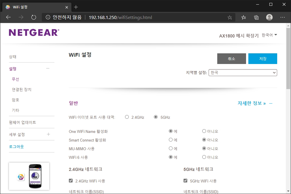 설정 메뉴는 무선과 연결된 장치 그리고 암호 등으로 구성되어 있습니다. 특히 무선에서는 WiFi 이더넷 포트 사용 대역이나 One WiFi Name 활성화 등의 기능들이 준비되어 있습니다.