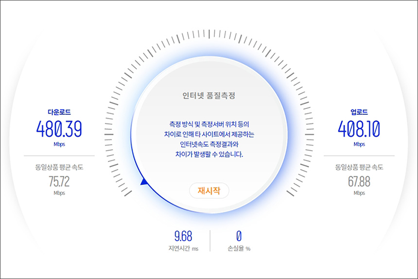 공유기에서 멀지 않은 장소에 넷기어 EAX20 와이파이 증폭기를 배치한 후에 기가비트 이더넷 포트의 속도를 확인해 보면 유선 연결이 필요 없을 정도로 빨랐습니다. 그래서 데이터를 많이 사용하는 콘솔 게임기나 셋톱박스 등을 설치해도 부담이 없을 것 같습니다.