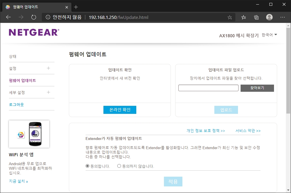 넷기어 EAX20 와이파이 증폭기의 WEB GUI는 www.mywifiext.net이나 192.168.1.250라는 주소로 접속할 수 있습니다. 그리고 홈 화면에서 현재 네트워크 상태를 바로 확인할 수 있습니다.