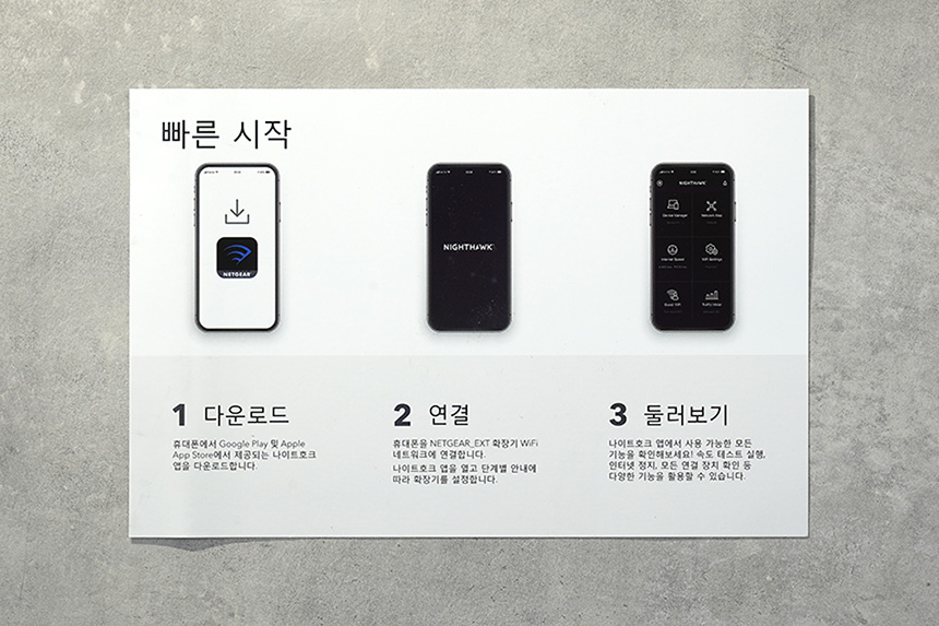 넷기어 EAX20 와이파이 증폭기의 구성품을 살펴보면 빠른 시작 가이드가 한 장 포함되어 있습니다. 나이트호크 앱의 사용 방법과 증폭기의 구조 등이 설명되어 있으니 한 번 살펴보시길 바랍니다.