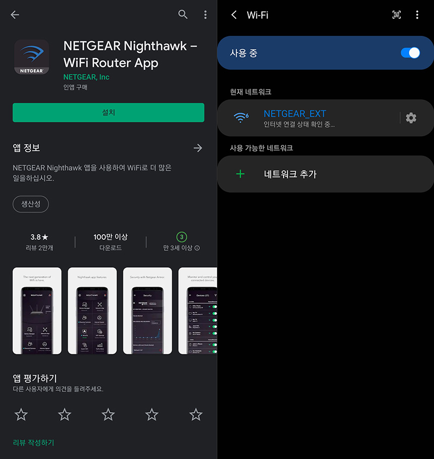 그리고 넷기어 EAX20 와이파이 증폭기는 나이트호크(Nighthawk) 앱을 통해서 간단하게 초기 설정을 진행하고 상태를 확인할 수 있습니다. 아이폰과 안드로이드 스마트폰에서 모두 사용할 수 있고 활용 방법은 잠시 후에 살펴보도록 하겠습니다.