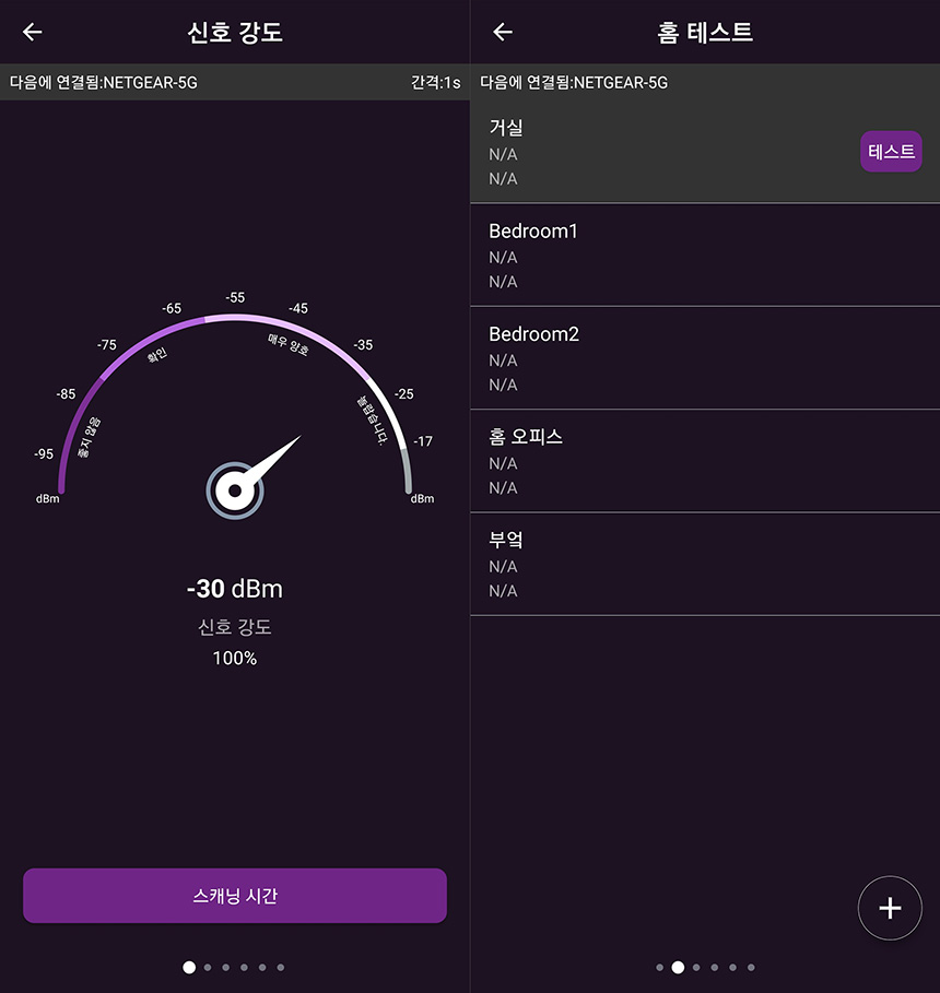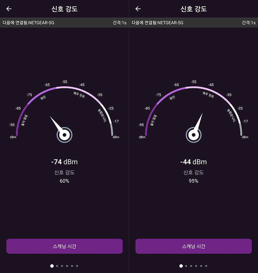실제로 같은 장소에서 넷기어 EAX20 와이파이 증폭기의 사용 여부에 따른 와이파이 신호 강도의 차이를 비교해 보면 유의미하게 개선되는 것을 확인할 수 있습니다.