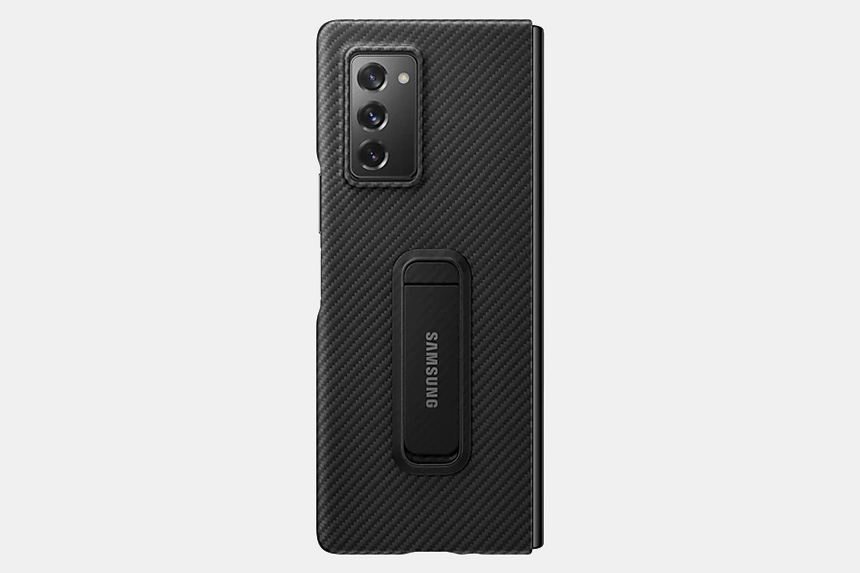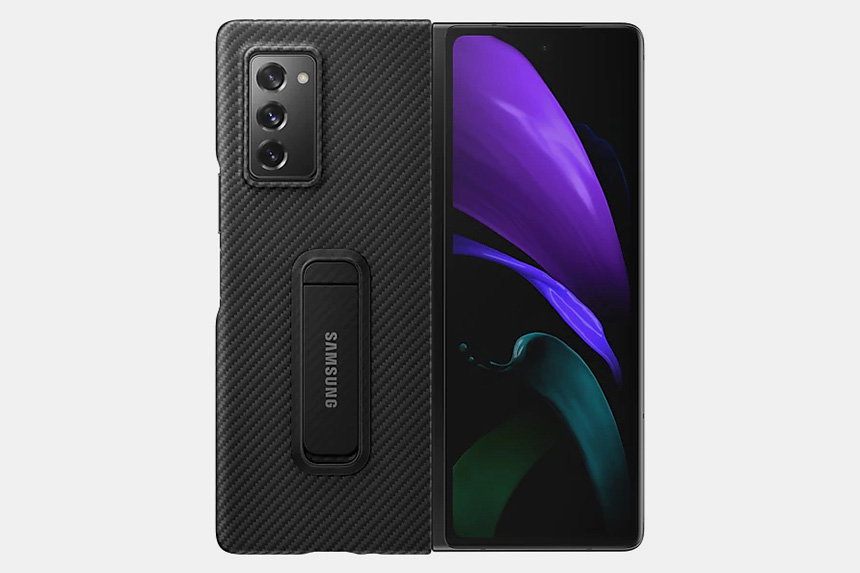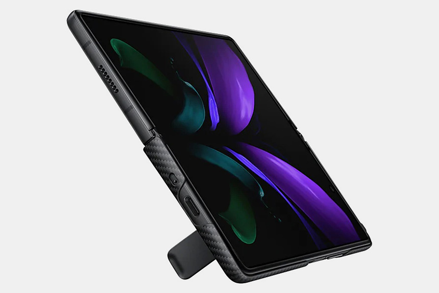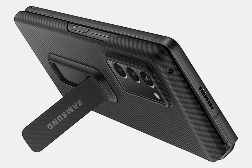 아라미드 스탠딩 커버는 갤럭시 Z 폴드2를 접었을 때 펼쳤을 때 모두 일정 각도로 세워놓을 수 있도록 제작되었습니다. 동영상 등을 감상하는 분들에게 유용할 것으로 보입니다.