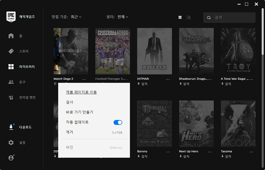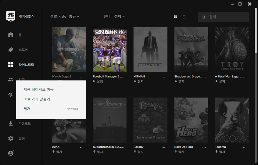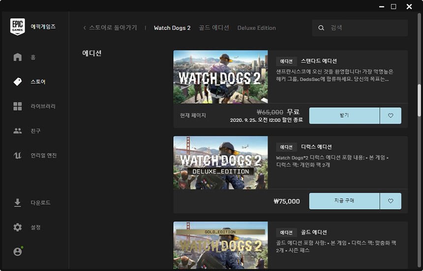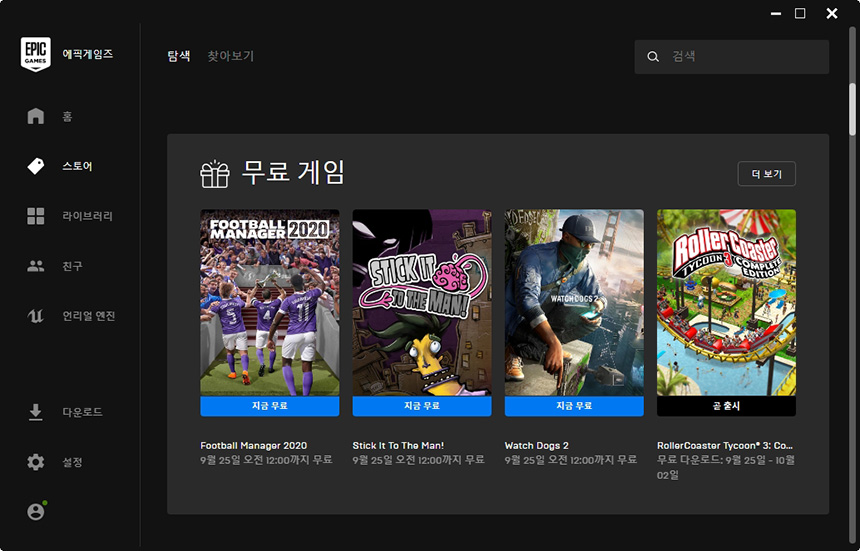 우선 에픽게임즈 런처를 다운로드 받으면 풋볼 매니저 2020과 Watch Dogs 2가 무료 게임에 포함된 것을 확인할 수 있습니다. 에픽의 배포가 놀라운 부분이라고 할 수 있습니다.