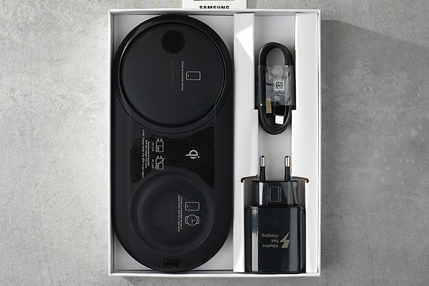 우선 삼성 무선충전패드 듀오(EP-P5200) 본체를 확인해보면 왼쪽에는 스마트폰 그리고 오른쪽에는 스마트워치 등의 제품을 충전하라는 문구가 표시되어 있습니다. 그리고 동봉된 25W 출력의 어댑터와 함께 사용하는 것을 권장한다고 합니다.