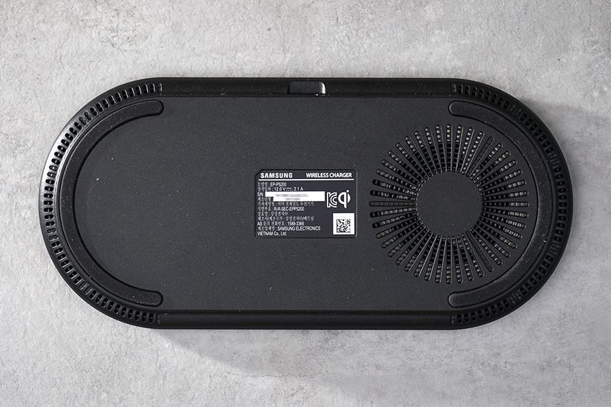 바닥을 살펴보면 테두리 부분에 미끄럼 방지 패드가 부착되어 있고 오른쪽에는 조용한 쿨링 팬이 탑재되었습니다. 실제로 무선 충전을 하면 생각 이상의 발열이 발생하고 여름철에는 조금 불쾌할 수 있습니다.