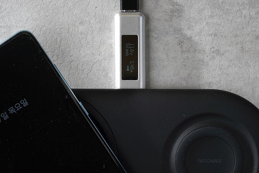 오른쪽 안착면 같은 경우에는 11.5V/1.03A로 약 11.8W로 충전이 되었습니다. 왼쪽에 비하면 약간 느리지만 그래도 이 정도라면 일반적으로 사용하는데 불편하지는 않을 것 같습니다. 그리고 두 대를 동시에 충전하면 출력이 더 떨어질 수 있습니다.