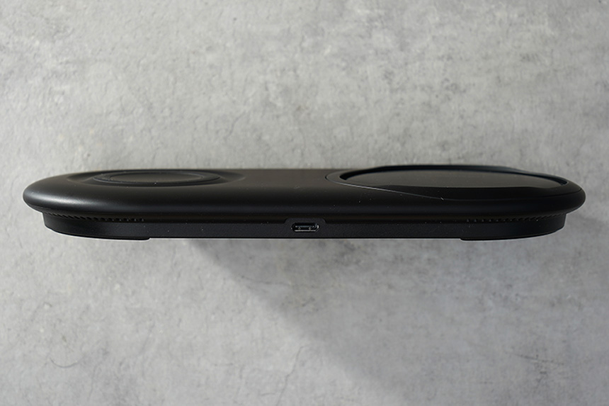 삼성 무선충전패드 듀오(EP-P5200)의 높이는 18.05mm로 사용하는데 크게 불편하지는 않은 수준이라고 생각되었습니다. 그리고 뒤쪽에 케이블을 연결할 수 있는 커넥터가 준비되어 있습니다.
