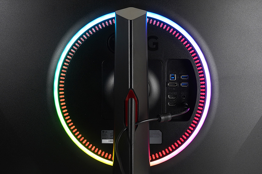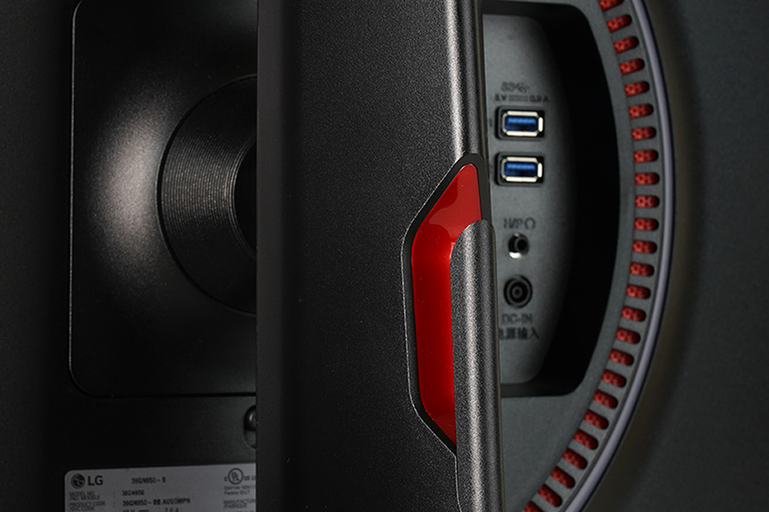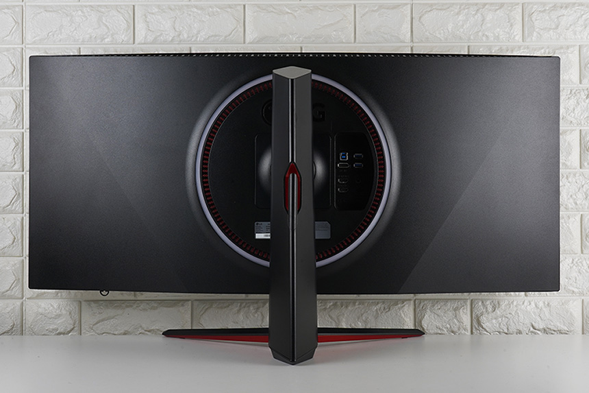LG 울트라기어 38GN950의 뒷면은 상당히 세련된 형태로 제작되었습니다. 특히 스탠드의 디자인은 물론이고 기능이 뛰어나서 활용도가 높다는 점이 유용한 부분입니다.