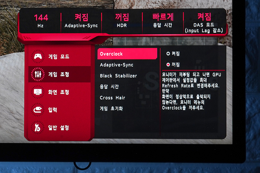 게임 조정 메뉴를 확인해보면 오버클럭(Overclok) 메뉴가 활성화되어 있는데 만약 주사율을 144Hz로 설정하기 원하는 분들은 켜짐을 선택해주면 됩니다. 그리고 정상적으로 화면이 출력되지 않는다면 꺼짐으로 설정하는 것을 추천합니다.