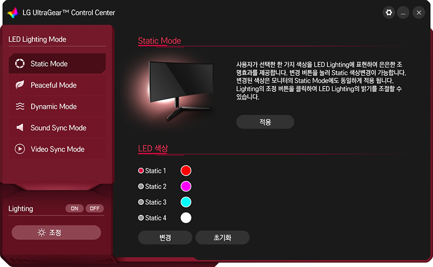 우선 스태틱(Static)이나 피스풀(Peaceful) 모드에서는 조명을 단색으로 지정하거나 색상이 순환되도록 설정할 수 있습니다. 화면의 내용이나 취향에 따라서 설정해주는 것이 좋을 것 같습니다.