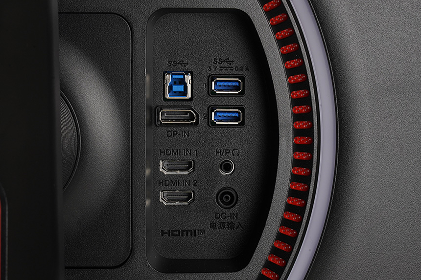 LG 울트라기어 38GN950의 입출력 단자를 확인해 보면 2개의 HDMI 2.0 포트와 Display Port 1.4 그리고 헤드폰 아웃과 USB 허브 등이 준비되어 있습니다. 그리고 2세대 위닝포스라이팅 간접조명을 컴퓨터에서 컨트롤 하길 원하는 분들은 구성품에 포함된 USB 3.0 업스트림 케이블을 연결해주어야 합니다.