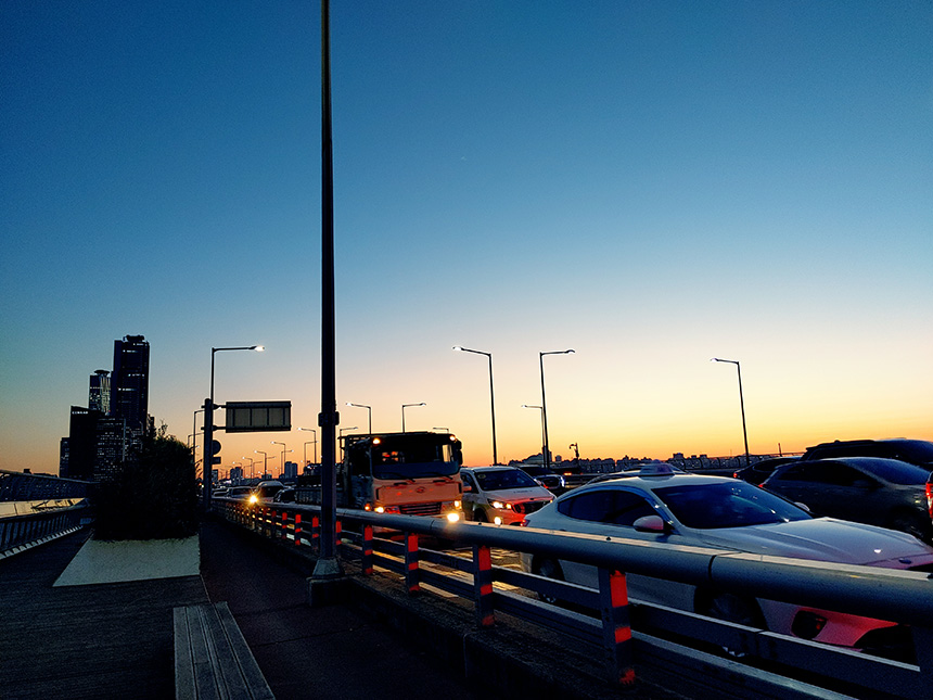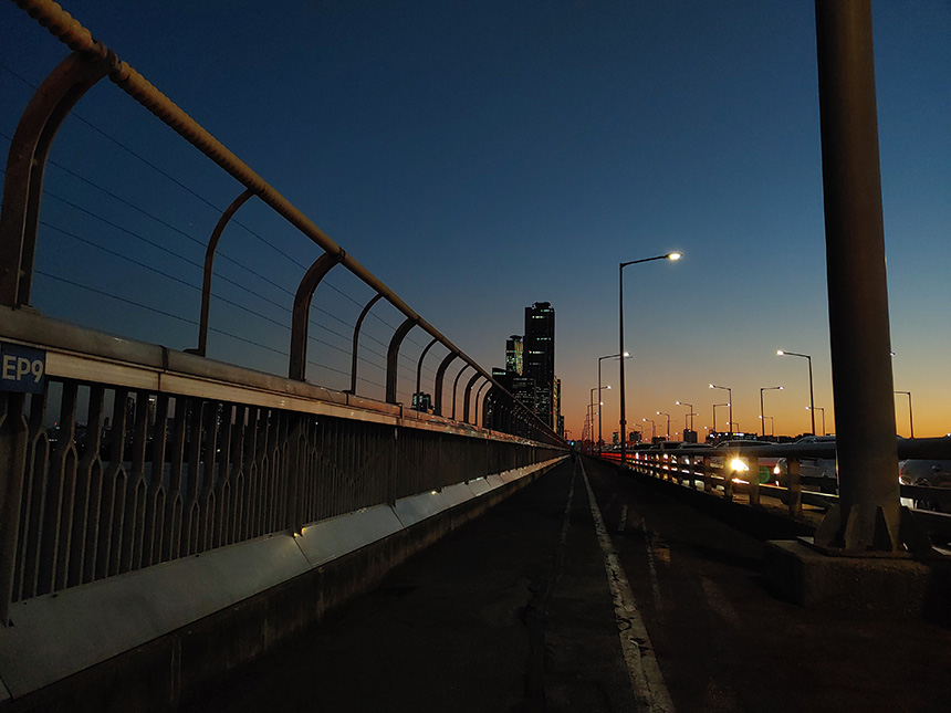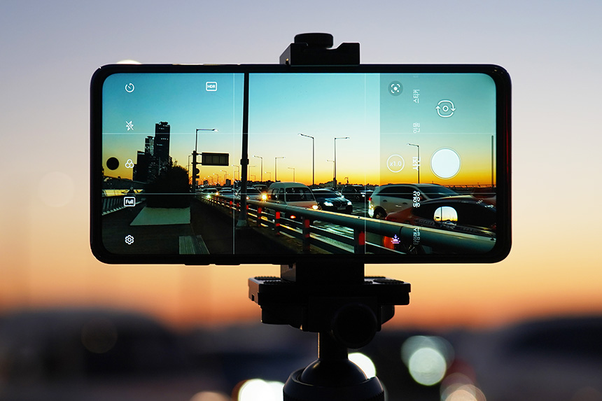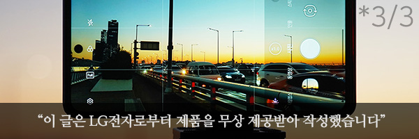 나이트 뷰는 야경을 찍기 위한 기능인데요. 간단하게 노출을 변경할 수 있는 메뉴가 준비되어 있습니다. 그리고 야간에 사진을 찍기 위해서는 삼각대와 같이 LG Q92 5G 스마트폰을 고정해 줄 수 있는 액세서리가 필요합니다.