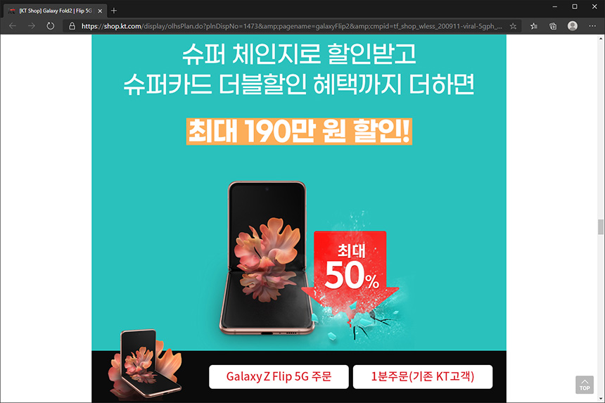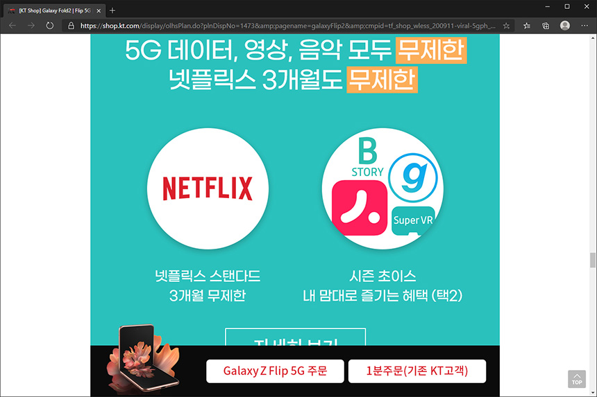 그리고 KT에서는 슈퍼체인지라는 제도를 운용하고 있는데요. 갤럭시 Z 플립 5G를 2년 동안 사용하고 반납하면 출고가의 최대 50%를 보상받을 수 있습니다. 자신의 사용 패턴을 확인해보신 후에 서비스 가입하시는 것이 좋을 것 같습니다.
