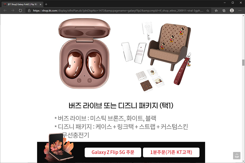 마지막으로 삼성전자에서는 버즈 라이브 또는 디즈니 패키지(케이스, 링크택, 스트랩, 커스텀 스킨, 무선충전기) 중의 하나를 제공합니다. 오픈형 무선 이어폰을 좋아하는 분들은 버즈 라이브를 선택하는 것이 좋을 것 같습니다.