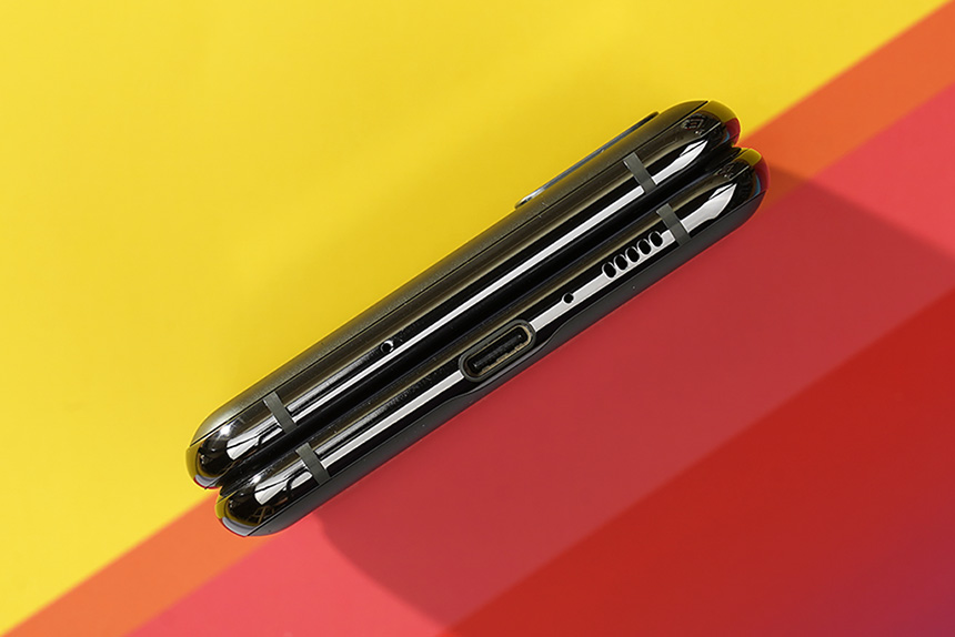 갤럭시 Z 플립 5G의 아래쪽에는 USB C타입 커넥터와 스피커가 배치되어 있습니다. 그리고 아쉬운 부분은 스테레오 스피커와 3.5mm 이어폰 단자를 지원하지는 않는다는 점입니다.
