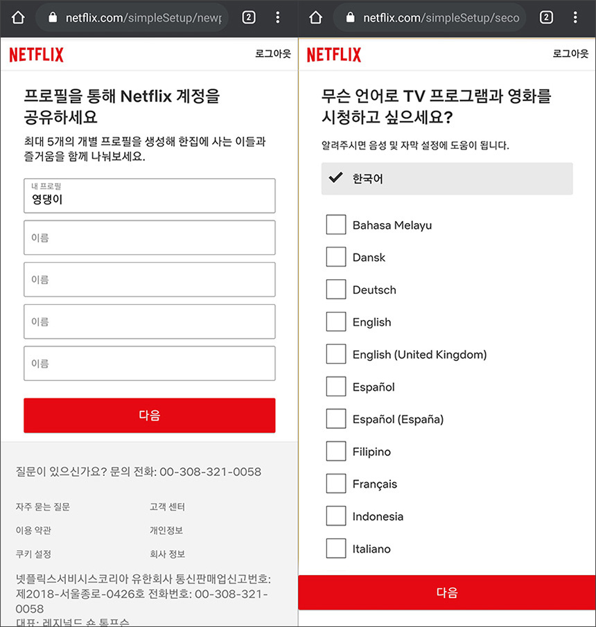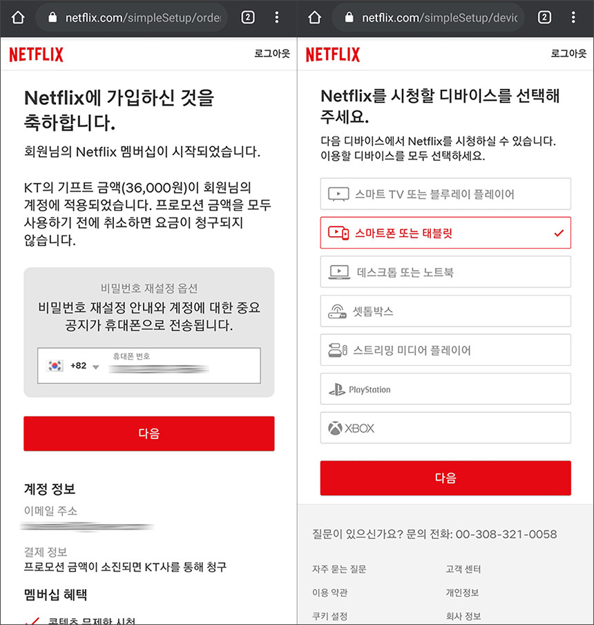 다음에는 비밀번호 재설정 등에 필요한 휴대폰 번호가 자동으로 불러와지고 넷플릭스를 시청할 디바이스 등을 선택해주면 됩니다. 참고로 넷플릭스 스탠다드 요금제는 최대 2명이 동시에 시청할 수 있습니다.