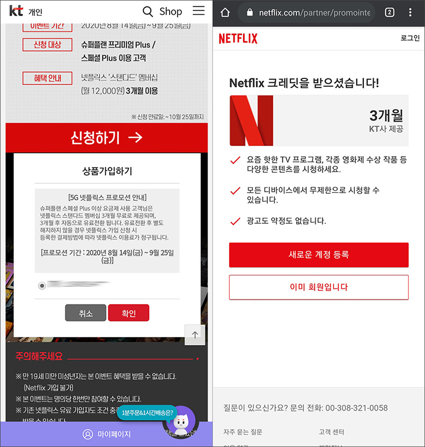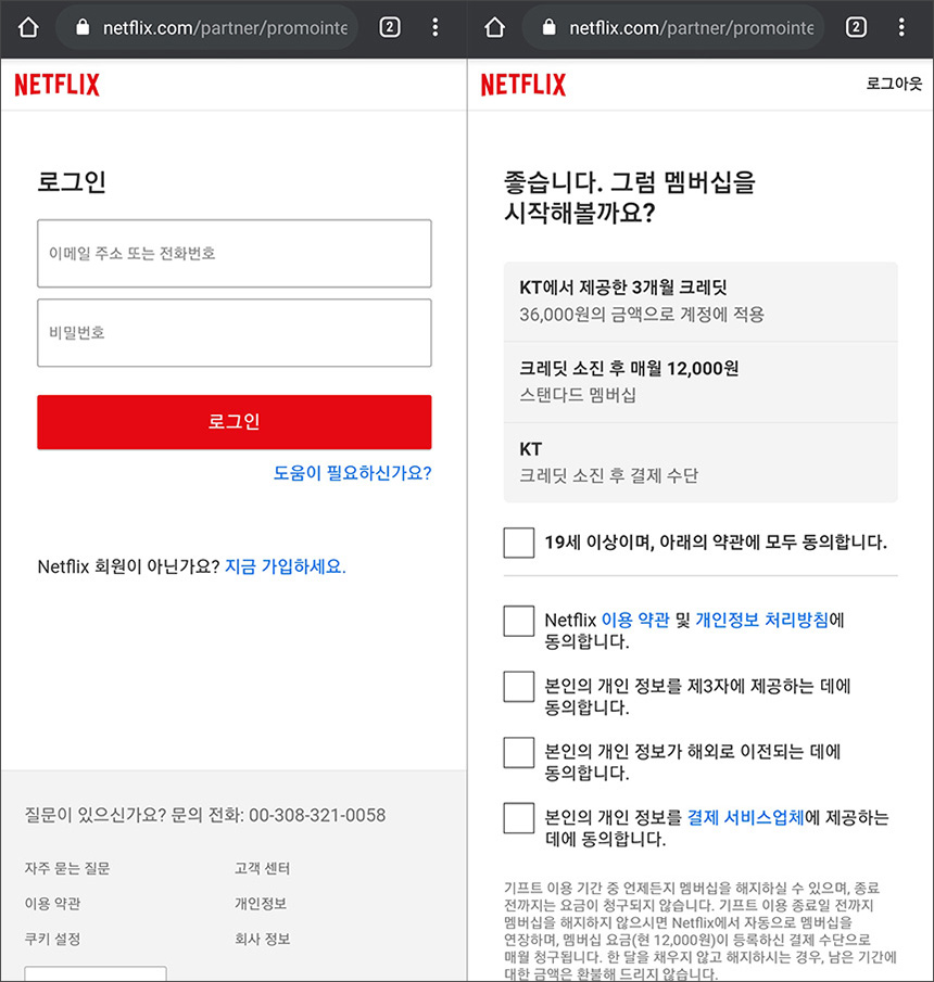 넷플릭스에 로그인을 하면 KT에서 제공하는 3개월 크레딧이 준비되어 있고 금액으로는 36,000원에 해당한다는 내용이 설명되고 소진 후에는 아마도 KT에서 결제를 대행하는 것으로 보입니다.